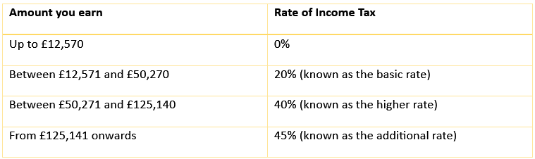 Frozen at their existing rates until 2028, the UK Income Tax brackets are shown in the table below.